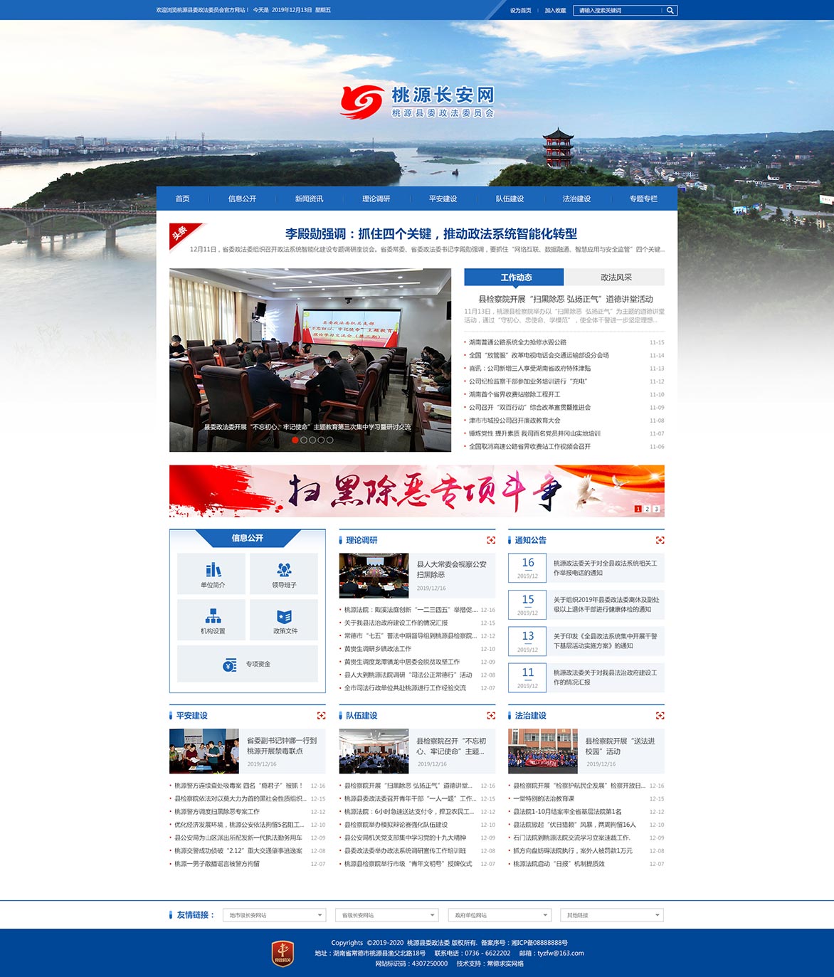 中共桃源縣委政法委員會成立于1982年,下設辦公室、政工室、執(zhí)法監(jiān)督室三個內設機構。2002年4月,政法委實施機構改革,政法委與桃源縣社會治安綜合治理委員會辦公室(2011年,全稱變更為桃源縣社會管理綜合治理委員會辦公室,簡稱縣綜治辦)合署辦公。2009年12月,成立桃源縣維護穩(wěn)定工作辦公室,與縣委政法委、縣綜治辦一個機構,三塊牌子??h委政法委是縣委領導政法工作的職能部門,縣綜治辦、縣穩(wěn)定辦是協(xié)助縣委、縣政府領導全縣社會管理綜合治理工作、維護穩(wěn)定工作常設議事機構的辦事機構。